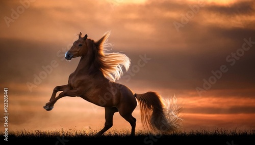 horse, dancing, field, ai, generated, wilderness, animal, horse, wild, meadow, landscape, grass, lawn, nature, green, skyline, panorama, panoramic, view, scene, brown, sunset, sundown, twilight