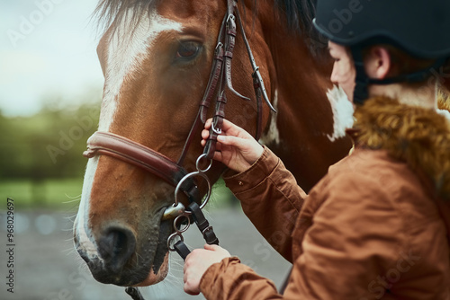 Horse, farm and girl prepare bridle for race, sport and training at countryside ranch. Animal, equestrian and hands adjust reins for riding with pet for safety, care or teenager getting ready outdoor
