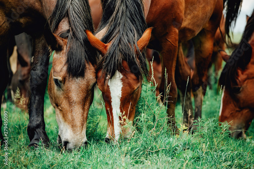 Horse head grazing in a meadow and eating grass in a green field in springtime