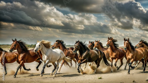 horse herd run in desert sand storm