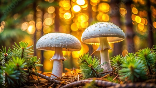 mushroom, forest, bokeh, spruce, pine needle, fungal, nature, timberland, wildlife, closeup, detail, autumn, spring, summer, photo, image, picture, royalty free, hi-res, background, mycology, fungal, flora, plant, ecology, environment, forest floor, organic, food, ingredient, culinary, cooking, natural background, foraging