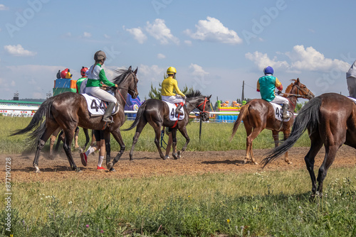 Horse racing at the racetrack. A horse led by a jockey. Horse riding competitions. A rider on a horse. Horses gallop along the racetrack track.
