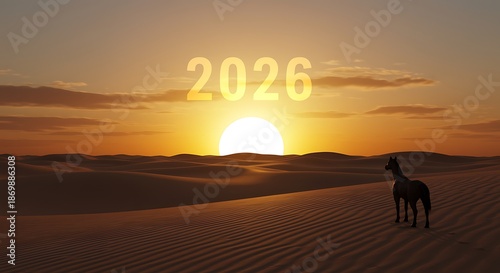 Horse standing in desert at sunset with 2026 text overlay