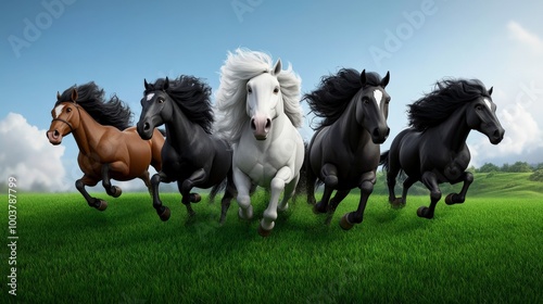 Horses Galloping Through the Grass: A breathtaking capture of five horses running in a field, their manes flowing in the wind.