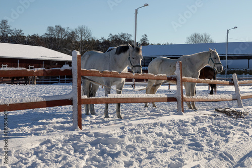 Horses in an open paddock on a sunny winter morning