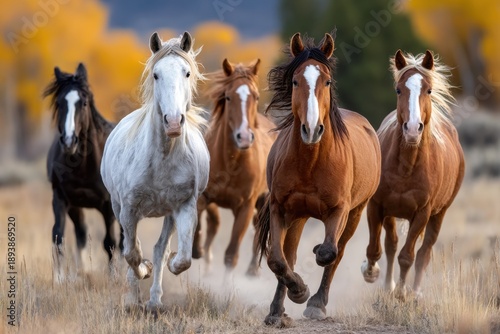 horse, running, field, autumn, fall, nature, wildlife, animal, mammal, equine, herd, gallop, freedom, wild, mane, coat, hoof, dust, blur, motion, action, landscape, scenery, colourful, vibrant, gold, tree, foliage, leaf, sunlight, outdoors, rural, country, western, america, us, beauty, power, grace, majestic, spirited, dynamic, energy, speed
