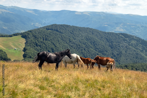 Horses with a foal walking in the mountains on a meadow on a warm summer day. Natural background
