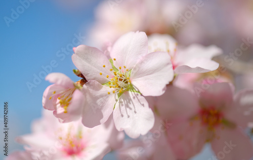 Horticulture of Gran Canaria - almond trees blooming in Tejeda in January, macro floral background
