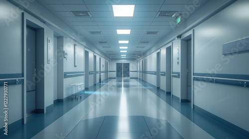 corridor, white, blue, light, wall, long, narrow, hospital, cool, series, ceiling, soft, glow, floor, pattern, touch, colours, monochrome, setting, railing, sense, safety, order, door, visible, small, cart, people, present, blue light, ceiling light, whitewall, right side