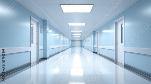 Hospital Interior Long Corridor with Blue Walls, White Doors, and Bright Lighting - Clean, Modern Design