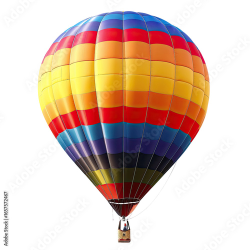 hot air balloon, colourful, flight, up high, balloon, air, flying, sky, adventure, travel, bright, vibrant, striped, pattern, rainbow, gradient, red, orange, yellow, green, blue, purple, floating, aviation, transportation, leisure, tour tourism, aerial, freedom, summer, daylight, daytime, cloudless, uplifting, optimistic, cheerful, scenic, beautiful, isolated, cut-out, background, object, design, decorative, festive, graphic, artistic