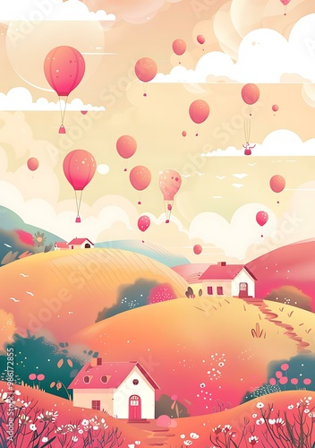 balloon, hot air balloon, landscape, hill, house, sky, cloud, illustration, art, digital artwork, colourful, dreamy, fantasy, whimsical, nature, field, tree, flower, summer, spring, travel, adventure, up, bright, sunset, sunrise