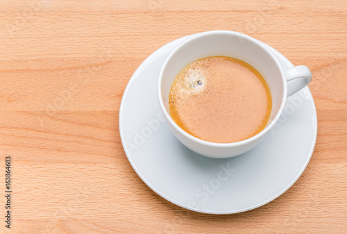 Hot black coffee with foam bubbles in white cup with wooden board in background, morning coffee concept.