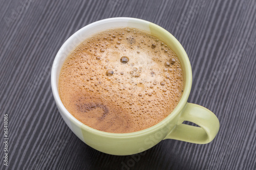 Hot black coffee with foaming in green cup placed on dark wooden table, morning coffee concept.