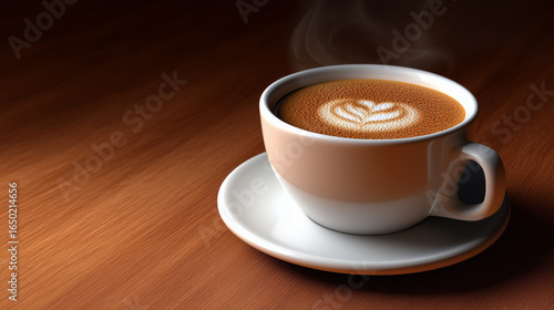Hot cappuccino with latte art on a white saucer sits on a brown wooden table with steaming vapor rising and copy space background.