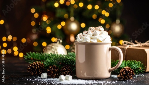 christmas, cup, hot drink, holiday, decoration, drink, food, tree, christmas, cake, winter, tea, gift, hot, celebration, chocolate, dessert, sweet, beverage, ornament, snow, brown, closeup, ball, box