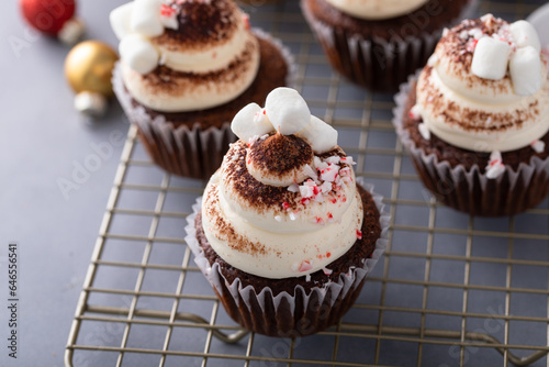 Hot chocolate cupcakes with mini marshmallows, peppermint candy pieces and cocoa