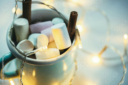 hot chocolate with marshmallow and Christmas lights cozy winter drink