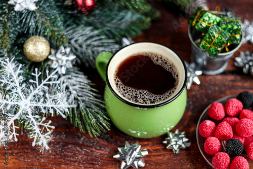 Hot coffee in a large ceramic, green cup. Christmas toys. New Year mood. On a dark background. Symbol of the coming year. Copy space.