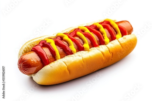 Hot Dog with Mustard and Ketchup on White Background Closeup