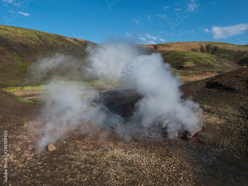 Hot spring with boiling water rising from rocks in Landmannalaugar colorful Rhyolit mountains on famous Laugavegur trek. Fjallabak Nature Reserve in Highlands of Iceland