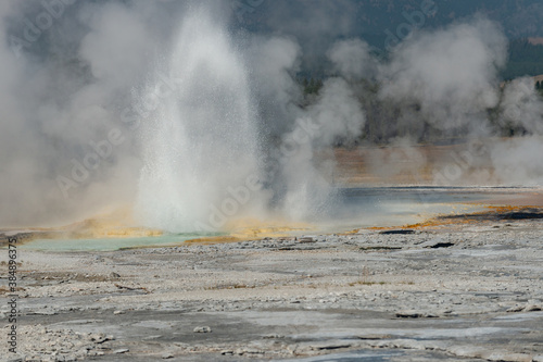 Hot Springs and gushing Geysers at Yellowstone National Park wilderness area atop a volcanic hot spot. USA.