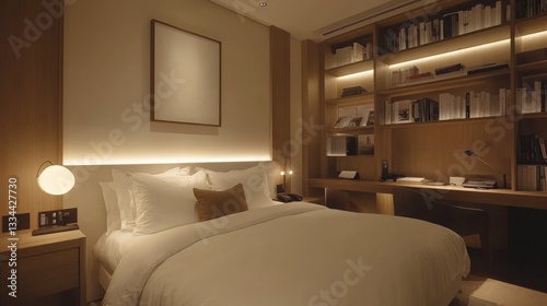 Hotel bedroom with a stylish desk lamp, warm color scheme, and a comfortable reading nook.