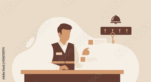 hotel, receptionist, service, information, key, guest, hospitality, room, tour tourism, travel, reception, desk, check, counter, business, vector, illustration, graphic, booking, bell, accommodation, vacancy, welcome, resort, men at work, staff, person, uniform, professional, manager, flat, design, cartoon, modern, minimalist, brown, beige, background, corporate, symbol