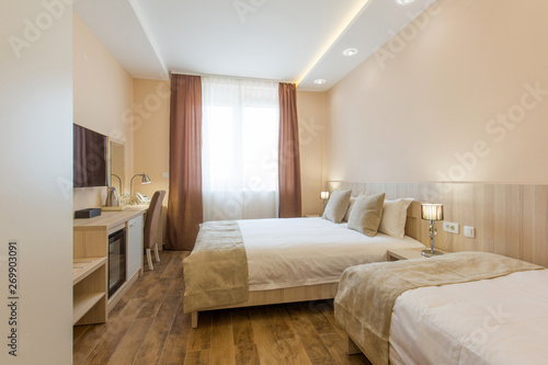 interior, hotel, furniture, bedchamber, bed, luxury, home, beige, design, white, decor, room, apartment, pillow, comfortable, house, modern, elegance, residential, floor, nobody, wall, contemporary, double, style, light, blanket, beautiful, window, relaxation, cushion, sleep, new, living, architecture, decoration, bedding, household, clean, inside, wood, rest, indoor, table, luxurious, indoor, ceiling