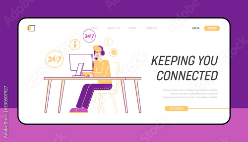 call, center, hot line, client, landing, service, staff, headset, work, computer, operator, client, character, communication, technical, support, specialist, linear, solve, problem, online, vector, man, people, person, outline, working, contact, help desk, user, responsibility, question, asking, answer, assistance, mail, manager, profession, men at work, cyberspace, adviser, phone, information, job, earphones, page, template, concept, line art, illustration