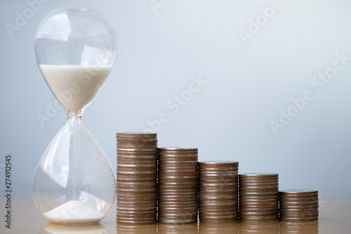 Hourglass blue sand and stack of coins. Business investment growth concept. money saving and Investment. Risk management. Time is money. Time investment and retirement saving. 401K.