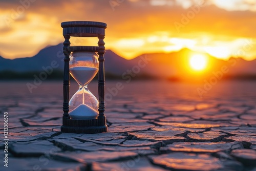 Hourglass on cracked earth at sunset. Illustrates time passing, fragility, and end of era.