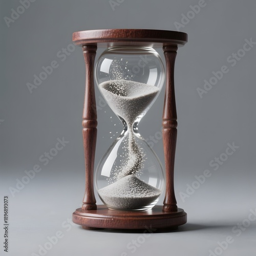 Hourglass with flowing sand on a wooden stand against a gray background symbolizing time passing