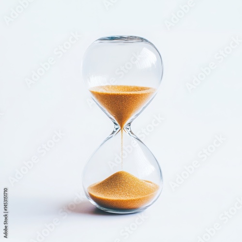 hourglass, sand, time, clock, glasses, countdown, deadline, measure, flow, watch, moment, past, future, present, urgency, reminder, waiting, patience, clear, stand, against, white, gold, from, upper, bulb