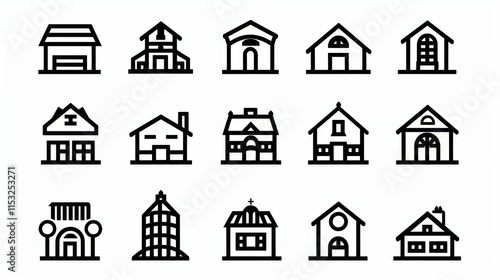 office, house, home, apartment, school, city, town, real estate, architecture, skyscraper, structure, design, icon, vector, signs, illustration, symbol, collection, modern, simple, line, shape, outline, enterprise, white background, station, residence