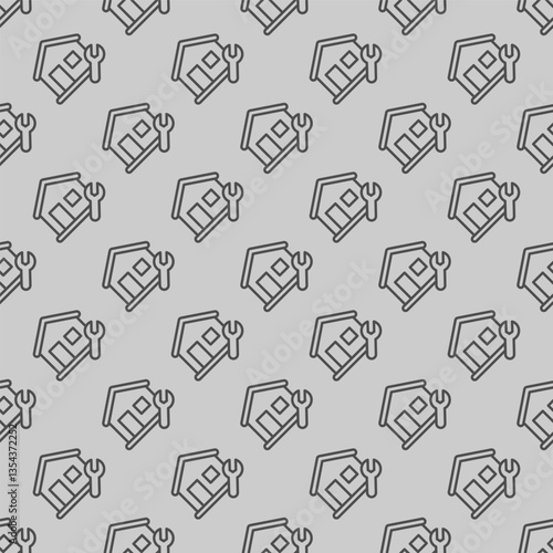 House and wrench line seamless pattern, repair service theme. Vector graphics. Cottage building with repair tool sign with background, repeat line icon.