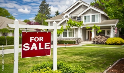 House for sale. A stunning real estate photograph of a suburban home with a "FOR SALE" sign in the yard