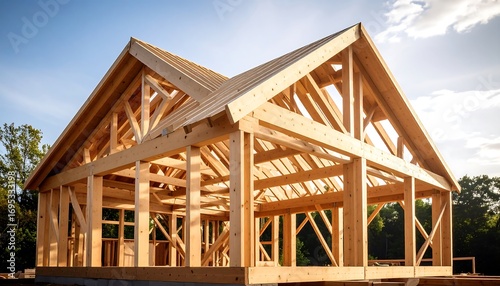 House Frame Construction Timber Skeleton Under Blue Sky with New Home Build.