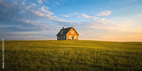 house, home, field, grass, green, sky, sunset, sun, cloud, rural, landscape, nature, scenic, view, country, farm, agriculture, property, real estate, building, architecture, residential, dwelling, bungalow, tranquil, peaceful, serene, idylli, calm, quiet, solitary, isolated, horizon, summer, spring, day, light, gold, yellow, orange, blue, beautiful, amazing, stunning, picturesque