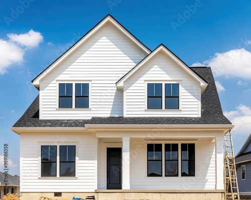 House under construction with siding being painted, workers with brushes and ladders, painting work, finishing touch