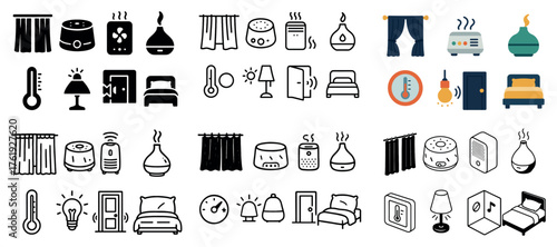thermostat, lamp, humidifier, furniture, curtain, temperature, bedchamber, bed, fan, diffuser, heater, blackout, air, aromatherapy, lighting, decor, interior, appliance, icon, window, nightstand, clock, climate, illustration, design