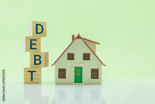 Household or mortgage debt, financial concept : Model house with wood cubes and the word DEBT on a table, depicting debt secured by real property and the sum of aggregate outstanding principal balance