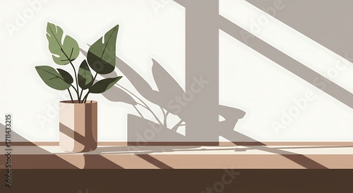 Houseplant in a pot on windowsill with sunlight and shadows, cozy interior, and illustration.