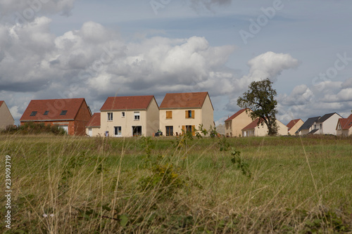 house, heaven, building, landscape, grass, architecture, green, new, village, bungalow, rural, country, farm, nature, field, blue, roof, summer, countryside, cloud, panorama, residential, villa, field