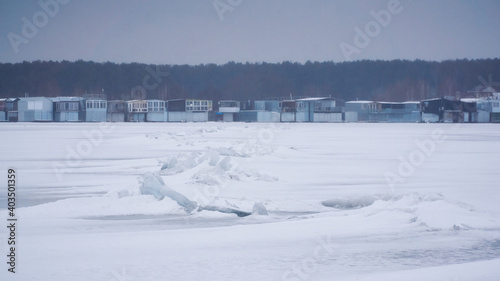Houses of a fishing village on the banks of the frozen Voronezh reservoir in winter
