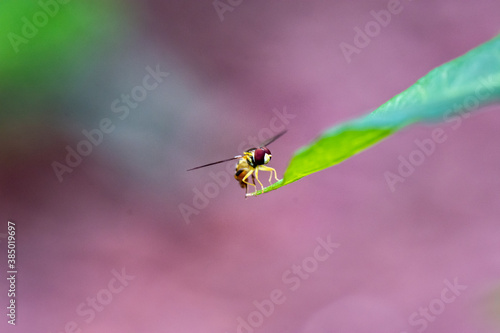 Hoverfly on the Edge of Leaf, Mauve Background
