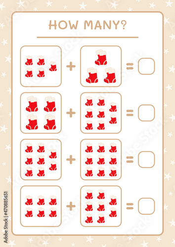 How many christmas sock, game for children. Vector illustration, printable worksheet