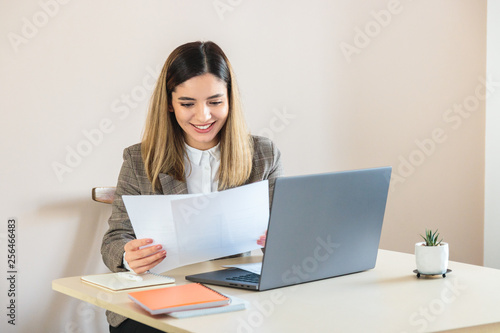 HR manager beautiful woman smiling comparing CV of job candidates
