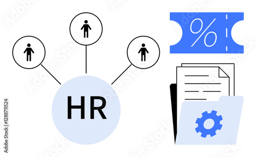 HR with connected employees, percentage sign, documents in folder with gear. Ideal for employee management, performance evaluation, recruitment, HR planning, organization, administration