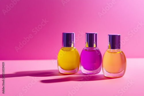 hree bottles of nail polish in pink, purple, and yellow colors are placed on the table with bright light and shadow
